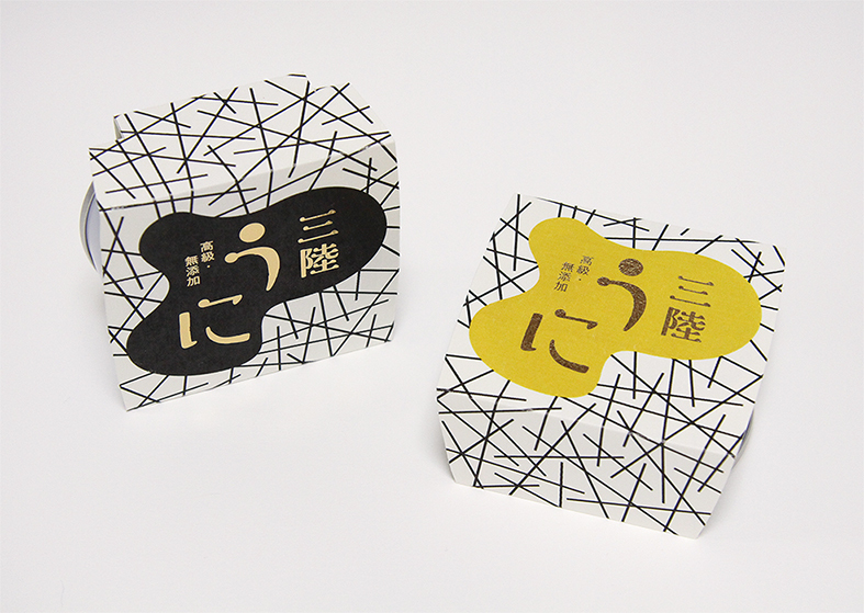 外箱でうにの黒いとげと、黄色くてやわ らかい身の部分をデザインで表現してみました。
