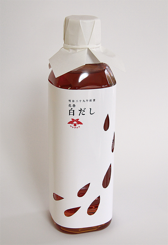 実際はビニールの透明部分となります。商品名は「花巻白だし」、「明治三十九年創業」という